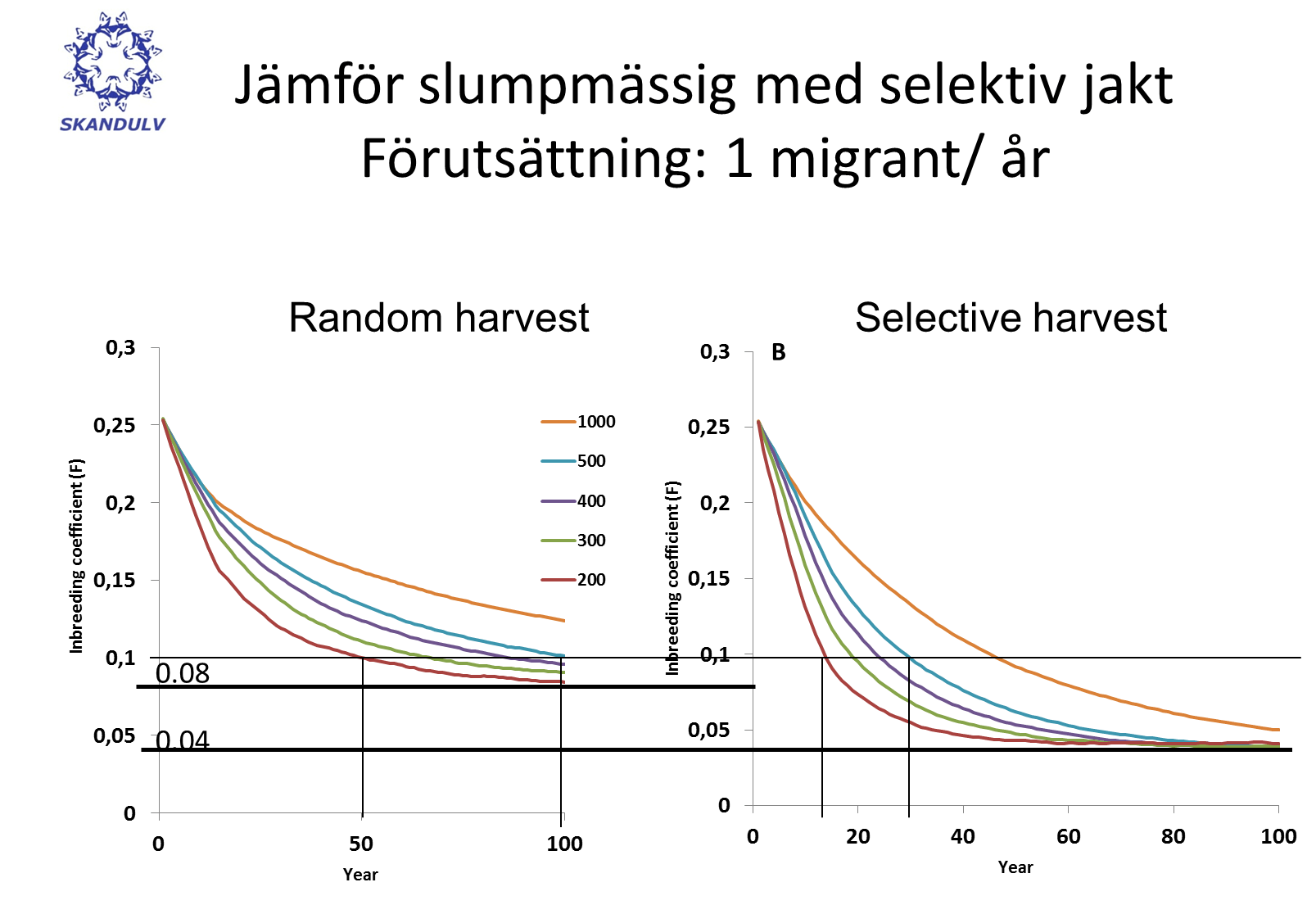 Men jag gör ett påpekande. Även om reduktionen av vargstammen inte gjordes med selektiv jakt så visar diagrammen du hänvisar till att inaveln minskar ju mindre vargstammen är. Mikael Karlsson m fl behöver alltså inte ens tro på selektiv jakt för att stödja vargjakt i syfte att minska vargstammens storlek och därmed största problem, inavel.